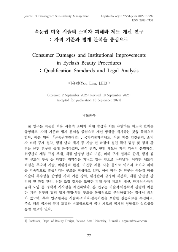 This study aims to identify the patterns of consumer damages caused by eyela sh beauty procedures and to examine the institutional shortcomings that lead to such damages, with a particular focus on qualification standards and legal analy sis. Through a literature review, the study analyzed domestic laws and policy en vironments covering the entire process of the procedures, including the Public H ealth Control Act, the national technical qualification system, product safety ma nagement, consumer damage relief procedures, and administrative enforcement m echanisms. The analysis revealed multiple vulnerabilities in the current system, su ch as unclear qualification standards, absence of detailed hygiene regulations, ins ufficient product safety control, limitations in damage relief procedures, and a la ck of effectiveness in administrative enforcement. These institutional gaps have c ontributed to a structure in which unqualified procedures, unsanitary environmen ts, and the use of uncertified products continue to generate consumer damages. Based on these findings, the study proposes policy recommendations including st rengthening qualification standards tailored to the characteristics of eyelash beaut y procedures, refining hygiene regulations, establishing full life-cycle management for product safety, improving damage relief systems through specialized mediatio n procedures, and introducing phased and differentiated regulations. Unlike previ ous studies that have primarily focused on technical or cosmetological perspectiv es, this study integrates legal, administrative, and market structure analyses, there by linking institutional deficiencies directly to patterns of consumer damages. Fut ure research should collect empirical data from practitioners, consumers, and sup ervisory agencies, and compare regulatory models from major foreign countries t o enhance the international consistency and effectiveness of the domestic system.