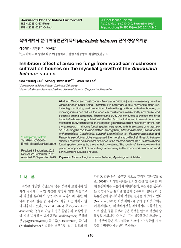 Wood ear mushrooms (Auricularia heimuer) are commercially used in various fields in South Korea. Therefore, it is necessary to take appropriate measures, including monitoring and prevention of microbial growth in cultivation houses, as microorganisms can reduce the wood ear mushroom’s marketability and cause food poisoning among consumers. Therefore, this study was conducted to evaluate the direct impact of airborne fungi isolated and identified from the indoor air of domestic wood ear mushroom cultivation houses on the mycelia growth of wood ear mushroom strains. For the evaluation, 11 airborne fungal species were tested with three strains of A. heimuer on PDA using the cocultivation method. Among them, Alternaria alternata, Cladosporium anthropophilum, Cochliobolus kusanoi, Lecanicillium sp., Periconia byssoides, and Periconia pseudobyssoides suppressed the mycelial growth of all three A. heimuer strains. There was no significant difference in the reaction against the 11 tested airborne fungal species among the three A. heimuer strains. The results of this study show that proper management of airborne fungi is necessary in the indoor environment of wood ear mushroom cultivation houses.