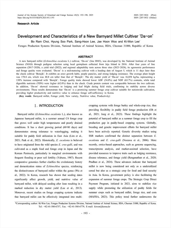 A new barnyard millet (Echinochloa esculenta L.) cultivar, ‘Da-on’ (line BM3), was developed by the National Institute of Animal Science (NIAS) through pedigree selection using local germplasm collected from Jeju Island in 2016. After four years of line separation (2017–2020), a yield trial (2022), and regional adaptability tests across three sites (2023–2024), its agronomic performance and forage quality were evaluated. ‘Da-on’ is a mid-maturing cultivar with a heading date of August 5, which is 11 days later than the check cultivar ‘Borajik’. It exhibits an erect growth habit, purple panicles, and strong lodging resistance. The average plant height was 178.8 cm, which was 40.8 cm taller than that of ‘Borajik’. The dry matter yield of ‘Da-on’ was 16,858 kg/ha, representing a 130% increase compared with ‘Borajik’. Forage quality traits showed lower ADF (34.0%) and NDF (63.7%) contents, while total digestible nutrients (TDN) were higher (62.0%) than in the check. Crude protein content was comparable between the two cultivars. In addition, ‘Da-on’ showed resistance to lodging and leaf blight during field trials, confirming its stability across diverse environments. These results demonstrate that ‘Da-on’ is a promising summer forage crop cultivar suitable for nationwide cultivation, providing higher productivity and nutritive value to enhance forage self-sufficiency in Korea.