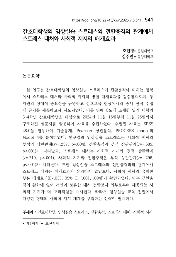 본 연구는 간호대학생의 임상실습 스트레스가 전환충격에 미치는 영향 에서 스트레스 대처와 사회적 지지의 병렬 매개효과를 검증함으로써, 두 자원의 상대적 중요성을 규명하고 간호교육 현장에서의 중재 전략 수립 에 근거를 제공하고자 시도되었다. 이를 위해 C도에 소재한 일개 대학의 3~4학년 간호대학생을 대상으로 2024년 11월 15일부터 11월 25일까지 구조화된 설문지를 활용하여 자료를 수집하였다. 수집된 자료는 SPSS 28.0을 활용하여 기술통계, Pearson 상관분석, PROCESS macro의 Model 4를 분석하였다. 연구결과 임상실습 스트레스는 사회적 지지와 부적의 상관관계(r =-.237, p=.004), 전환충격과 정적 상관관계(r =-.685, p<.001)가 나타났고, 스트레스 대처는 사회적 지지와 정적 상관관계 (r =.219, p<.001), 사회적 지지와 전환충격은 부적 상관관계(r =.-296, p<.001)가 나타났다. 또한 임상실습 스트레스와 전환충격과의 관계에서 스트레스 대처는 매개효과가 유의하지 않았으나, 사회적 지지의 유의한 부분 매개효과(B=.033, 95% CI [.001, .094])가 확인되었다. 이는 전환충 격의 완화에 있어 개인이 보유한 대처 전략보다 외부로부터 제공되는 사 회적 지지가 더 효과적임을 시사한다. 따라서 임상실습 교육 전반에서 다양한 형태의 사회적 지지 체계를 구축하는 전략이 필요하다.