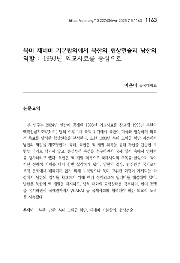 본 연구는 2024년 일반에 공개된 1993년 외교사료를 참고해 1993년 북한의 핵확산금지조약(NPT) 탈퇴 이후 1차 북핵 위기에서 북한이 미국과 협상하며 외교 적 목표를 달성한 협상전술을 분석한다. 또한 1993년 북미 고위급 회담 과정에서 남한의 역할을 재조명한다. 특히, 북한은 핵 개발 의혹을 통해 자신을 단순한 주 변부 국가로 남기지 않고, 중심부적 속성을 추구하면서 국제 질서 속에서 영향력 을 행사하려고 했다. 북한은 핵 개발 의혹으로 국제사회의 주목을 끌었으며 핵이 지닌 전략적 가치를 다시 한번 실감하게 됐다. 남한의 경우, 반주변부 국가로서 북핵 문제에서 배제되지 않기 위해 노력했으나 북미 고위급 회담이 개최되는 과 정에서 남한의 입지를 확보하기 위해 여러 정치외교적 딜레마를 해결해야 했다. 남한은 북한의 핵 개발을 저지하고, 남북 대화의 교착상태를 극복하며, 한미 동맹 을 유지하면서 국제원자력기구(IAEA) 등 국제사회와 협력해야 하는 외교적 노력 을 지속했다.