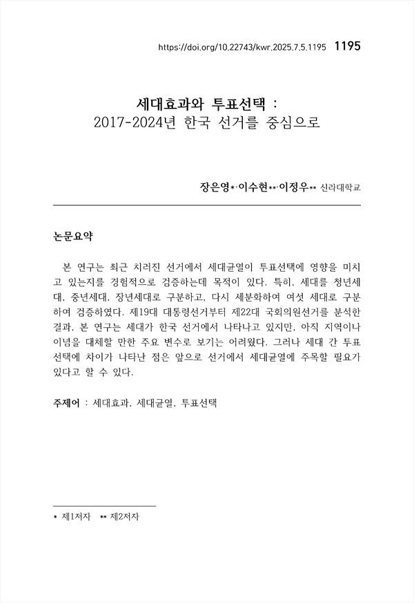 본 연구는 최근 치러진 선거에서 세대균열이 투표선택에 영향을 미치 고 있는지를 경험적으로 검증하는데 목적이 있다. 특히, 세대를 청년세 대, 중년세대, 장년세대로 구분하고, 다시 세분화하여 여섯 세대로 구분 하여 검증하였다. 제19대 대통령선거부터 제22대 국회의원선거를 분석한 결과, 본 연구는 세대가 한국 선거에서 나타나고 있지만, 아직 지역이나 이념을 대체할 만한 주요 변수로 보기는 어려웠다. 그러나 세대 간 투표 선택에 차이가 나타난 점은 앞으로 선거에서 세대균열에 주목할 필요가 있다고 할 수 있다.