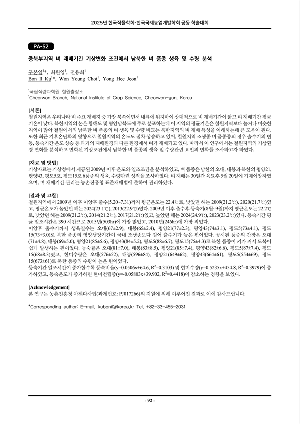 중북부지역 벼 재배기간 기상변화 조건에서 남북한 벼 품종 생육 및 수량 분석
