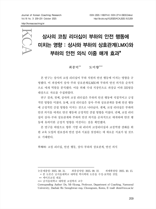 본 연구는 상사의 코칭 리더십이 부하 직원의 안전 행동에 미치는 영향을 규 명했다. 이 과정에서 상사-부하 상호관계(LMX)와 부하의 안전 의식을 순차적 으로 매개 역할을 분석했다. 이를 위해 국내 직장인으로 과장급 이하 325명을 대상으로 자료를 수집하였다. 연구 결과, 첫째, 상사의 코칭 리더십은 부하의 안전 행동에 직접적이고 긍정 적인 영향을 미쳤다. 둘째, 코칭 리더십은 상사-부하 상호관계를 통해 안전 행동 에 긍정적인 간접 영향을 미치는 것으로 나타났다. 셋째, 코칭 리더십은 부하의 안전 의식을 매개로 안전 행동에 긍정적인 간접 영향을 미쳤다. 넷째, 코칭 리더 십이 상사-부하 상호관계와 부하의 안전 의식을 순차적으로 매개하여 안전 행 동에 유의미한 긍정적 영향을 미친다는 점을 확인했다. 본 연구를 바탕으로 향후 기업 내 리더의 코칭리더십과 코칭역량 강화를 위 한 교육 도입의 필요성과 안전 성과 지표를 설정하는 데 새로운 지표가 될 것으 로 기대한다.