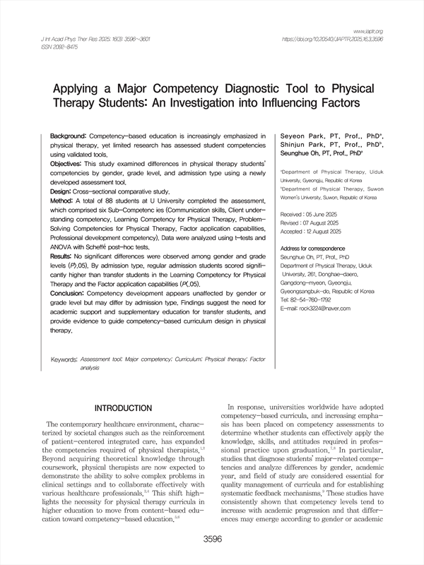 Background: Competency-based education is increasingly emphasized in physical therapy, yet limited research has assessed student competencies using validated tools. Objectives: This study examined differences in physical therapy students’ competencies by gender, grade level, and admission type using a newly developed assessment tool. Design: Cross-sectional comparative study. Method: A total of 88 students at U University completed the assessment, which comprised six Sub-Competenc ies (Communication skills, Client understanding competency, Learning Competency for Physical Therapy, Problem- Solving Competencies for Physical Therapy, Factor application capabilities, Professional development competency). Data were analyzed using t-tests and ANOVA with Scheffé post-hoc tests. Results: No significant differences were observed among gender and grade levels (P>.05). By admission type, regular admission students scored significantly higher than transfer students in the Learning Competency for Physical Therapy and the Factor application capabilities (P<.05). Conclusion: Competency development appears unaffected by gender or grade level but may differ by admission type. Findings suggest the need for academic support and supplementary education for transfer students, and provide evidence to guide competency-based curriculum design in physical therapy.