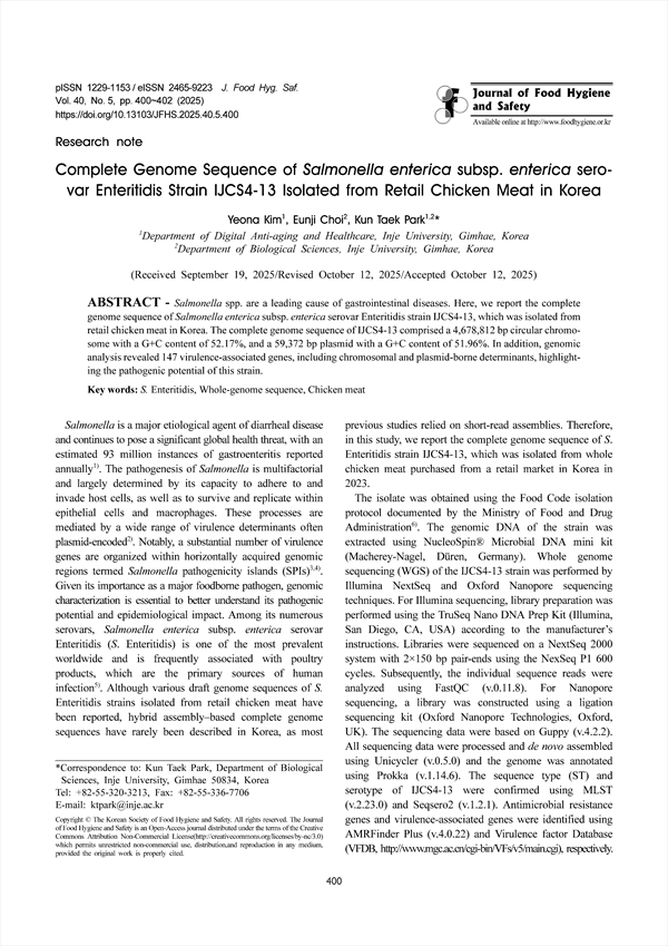 Salmonella는 전 세계적으로 위장관 질환을 일으키는 주 요 식중독 원인균 중 하나이다. 본 연구에서는 국내 유통 닭고기에서 분리된 Salmonella enterica subsp. enterica serovar Enteritidis (S. Enteritidis) IJCS4-13 균주에 대해 WGS를 이용한 유전체 분석을 진행하였다. 해당 균주의 유전체는 4,678,812 bp 크기의 원형 염색체 (G+C 함량 52.17%)와 59,372 bp 크기의 플라스미드 (G+C 함량 51.96%)로 구성되어 있었다. 유전체 분석 결과, 총 147개 의 병원성 관련 유전자를 확인하였다. 이들 유전자는 부 착, 침입, 대식세포 내 생존, 스트레스 적응 등 다양한 병 원성 기전에 관여하는 것으로 알려져있다. 따라서 본 균 주는 다수의 병원성 인자를 보유하고 있어 높은 독력 잠 재력을 지니고 있음을 시사한다. 본 연구에서 보고한 유 전체 정보는 S. Enteritidis의 병원성 메커니즘 규명 및 식 품 매개 감염병 관리에 중요한 기초 자료를 제공할 것이다.