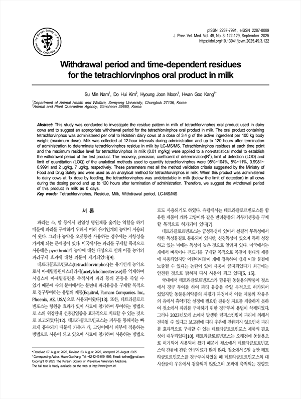 This study was conducted to investigate the residue pattern in milk of tetrachlorvinphos oral product used in dairy cows and to suggest an appropriate withdrawal period for the tetrachlorvinphos oral product in milk. The oral product containing tetrachlorvinphos was administered per oral to Holstein dairy cows at a dose of 3.4 g of the active ingredient per 100 kg body weight (maximum dose). Milk was collected at 12-hour intervals during administration and up to 120 hours after termination of administration to determinate tetrachlorvinphos residue in milk by LC-MS/MS. Tetrachlorvinphos residues at each time point and the maximum residue level for tetrachlorvinphos in milk (0.01 mg/kg) were applied to a non-statistical model to establish the withdrawal period of the test product. The recovery, precision, coefficient of determination(R2), limit of detection (LOD) and limit of quantitation (LOQ) of the analytical methods used to quantify tetrachlorvinphos were 98%~104%, 5%~11%, 0.9981~ 0.9991 and 2 μg/kg, 7 μg/kg, respectively. These parameters met all the method validation criteria suggested by the Ministry of Food and Drug Safety and were used as an analytical method for tetrachlorvinphos in milk. When this product was administered to dairy cows at 1x dose by feeding, the tetrachlorvinphos was undetectable in milk (below the limit of detection) in all cows during the dosing period and up to 120 hours after termination of administration. Therefore, we suggest the withdrawal period of this product in milk as 0 days.