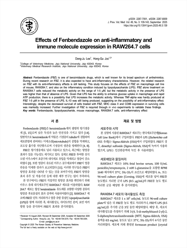 Fenbendazole (FBZ) is one of benzimidazole drugs, which is well known for its broad spectrum of anthelmintics. During recent research on FBZ, it is also expected to have anti-inflammatory characteristics. However, the related research on FBZ with its anti-inflammatory effects is still lacking. This study focuses on the effects of FBZ on macrophage cell line of mouse, RAW264.7, and also on the inflammatory condition induced by lipopolysaccharide (LPS). FBZ alone treatment on RAW264.7 cells reduced the metabolic activity on the range of 1-5 μM, but the metabolic activity in the presence of LPS was higher than that of absence of LPS. Given that LPS has the ability to enhance glucose uptake in macrophage and rapid ATP production, there is a possibility that LPS increases the metabolic activity. Whereas TNF-alpha was hardly produced at FBZ 1-5 μM in the presence of LPS, IL-10 was still being produced, suggesting on the possibility of anti-inflammatory effect. Interestingly, despite the decreased survival of cells treated with FBZ, MHC class II and CD86 expression in surviving cells was markedly increased. Further investigation of FBZ is required through in vivo experiments to validate these findings.