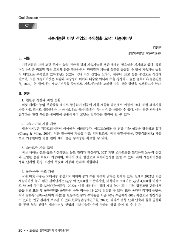 지속가능한 버섯 산업의 수익창출 모색: 새송이버섯