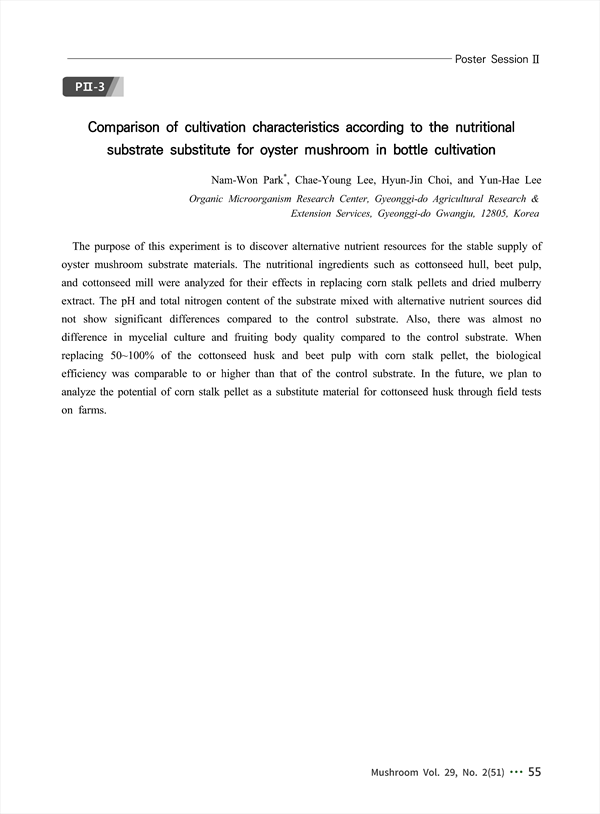 Comparison of cultivation characteristics according to the nutritional substrate substitute for oyster mushroom in bottle cultivation