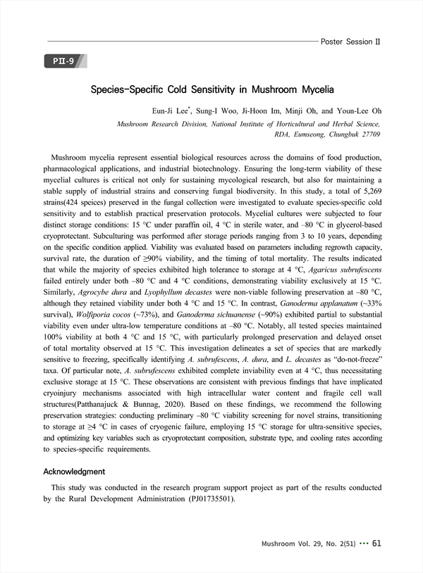 Minji Oh(Mushroom Research Division, National Institute of Horticultural and Herbal Science, RDA, Eumseong, Chungbuk 27709)