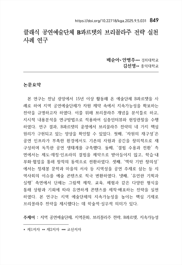 본 연구는 전남 광양에서 15년 이상 활동해 온 예술단체 B콰르텟을 사 례로 하여 지역 공연예술단체가 자원 제약 속에서 지속가능성을 확보하는 전략을 규명하고자 하였다. 이를 위해 브리꼴라주 개념을 분석틀로 하고, 지시적 내용분석을 연구방법으로 적용하여 심층인터뷰와 현장관찰을 수행 하였다. 연구 결과, B콰르텟의 운영에서 브리꼴라주 전략의 네 가지 핵심 원리가 구현되고 있는 양상을 확인할 수 있었다. 첫째, ‘자원의 재구성’은 공연 인프라가 부족한 환경에서도 기존의 자원과 공간을 창의적으로 재 구성하며 독특한 공연 생태계를 구축했다. 둘째, ‘결핍 수용과 전환’ 측 면에서는 제도·재정·인프라의 결핍을 제약으로 받아들이지 않고, 학습·내 부화·협업을 통해 창작의 동력으로 전환하였다. 셋째, ‘맥락 기반 창의성’ 에서는 정채봉 문학과 마을의 서사 등 지역성을 공연 주제로 삼는 등 지 역사회의 이슈를 예술 콘텐츠로 적극 변환하였다. 넷째, ‘유연한 기획과 실행’ 측면에서 단체는 그림책 제작, 교육, 체험과 같은 다양한 형식을 통해 상황과 기회에 따라 유연하게 콘텐츠를 제작·배포하는 전략을 실천 하였다. 본 연구는 지역 예술단체의 지속가능성을 높이는 핵심 기제로 브리꼴라주 전략을 제시했다는 데 학술적·실무적 의미가 있다.