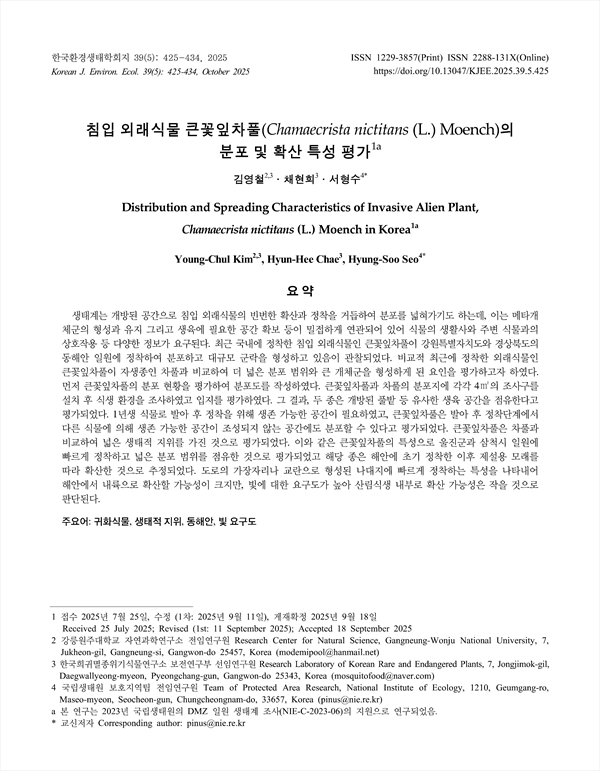 생태계는 개방된 공간으로 침입 외래식물의 빈번한 확산과 정착을 거듭하여 분포를 넓혀가기도 하는데, 이는 메타개 체군의 형성과 유지 그리고 생육에 필요한 공간 확보 등이 밀접하게 연관되어 있어 식물의 생활사와 주변 식물과의 상호작용 등 다양한 정보가 요구된다. 최근 국내에 정착한 침입 외래식물인 큰꽃잎차풀이 강원특별자치도와 경상북도의 동해안 일원에 정착하여 분포하고 대규모 군락을 형성하고 있음이 관찰되었다. 비교적 최근에 정착한 외래식물인 큰꽃잎차풀이 자생종인 차풀과 비교하여 더 넓은 분포 범위와 큰 개체군을 형성하게 된 요인을 평가하고자 하였다. 먼저 큰꽃잎차풀의 분포 현황을 평가하여 분포도를 작성하였다. 큰꽃잎차풀과 차풀의 분포지에 각각 4㎡의 조사구를 설치 후 식생 환경을 조사하였고 입지를 평가하였다. 그 결과, 두 종은 개방된 풀밭 등 유사한 생육 공간을 점유한다고 평가되었다. 1년생 식물로 발아 후 정착을 위해 생존 가능한 공간이 필요하였고, 큰꽃잎차풀은 발아 후 정착단계에서 다른 식물에 의해 생존 가능한 공간이 조성되지 않는 공간에도 분포할 수 있다고 평가되었다. 큰꽃잎차풀은 차풀과 비교하여 넓은 생태적 지위를 가진 것으로 평가되었다. 이와 같은 큰꽃잎차풀의 특성으로 울진군과 삼척시 일원에 빠르게 정착하고 넓은 분포 범위를 점유한 것으로 평가되었고 해당 종은 해안에 초기 정착한 이후 제설용 모래를 따라 확산한 것으로 추정되었다. 도로의 가장자리나 교란으로 형성된 나대지에 빠르게 정착하는 특성을 나타내어 해안에서 내륙으로 확산할 가능성이 크지만, 빛에 대한 요구도가 높아 산림식생 내부로 확산 가능성은 작을 것으로 판단된다.