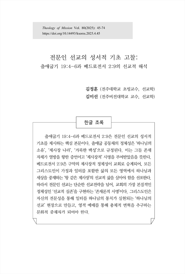 출애굽기 19:4-6과 베드로전서 2:9은 전문인 선교의 성서적 기초를 제시하는 핵심 본문이다. 출애굽 공동체의 정체성은 ‘하나님의 소유’, ‘제사장 나라’, ‘거룩한 백성’으로 규정된다. 이는 그들 존재 자체가 열방을 향한 증언이고 ‘제사장적’ 사명을 부여받았음을 뜻한다. 베드로전서 2:9은 구약의 제사장적 정체성이 교회로 승계되어, 모든 그리스도인이 가정과 일터를 포함한 삶의 모든 영역에서 하나님과 세상을 중재하는 ‘왕 같은 제사장’의 선교적 삶을 살아야 함을 선포한다. 따라서 전문인 선교는 단순한 선교전략을 넘어, 교회의 가장 본질적인 정체성인 ‘선교적 실존’을 구현하는 ‘존재론적 사명’이다. 그리스도인은 자신의 전문성을 통해 일터를 하나님의 통치가 실현되는 ‘하나님의 선교’ 현장으로 만들고, 영적 예배를 통해 총체적 변혁을 추구하는 문화적 중재자가 되어야 한다.