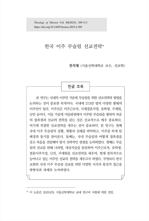 The purpose of this study is to discuss missionary strategies and methods for Muslim immigrants in Korea. There are 2.73 million immigrants in Korea, consisting of migrant workers, international marriages, international students, expariates and refugees. Establishing a point of contact with the gospel and a missionary strategy for Muslims who have immigrated from Islamic countries is crucial for missionary purposes. This study first examines the current status and reality of Muslim migrants in Korea, and explores the background and motivations behind their migration. Second, it discusses strategic perspectives on how to establish contact points and share the Gospel with Muslims in Korea.