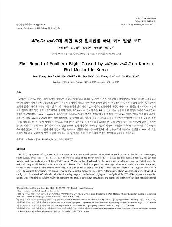2023년 경상남도 함안군 소재 포장내 재배중인 적갓의 지제부위의 줄기와 잎자루에서 흰비단병 증상이 발생하였다. 병징은 적갓의 지제부위의 줄기와 잎자루 아랫부분이 수침상으로 물러져 부패되어 서서히 시들고 결국 식물 전체가 말라 죽는다. 토양과 맞닿은 부위의 줄기와 잎자루에서 흰색의 곰팡이 균사체가 발생하였고 갈색의 작고 둥근 균핵이 많이 형성되었다. 감자한천배지에서 배양한 균총 역시 흰색을 띠고 시간이 지남에 따라 갈색의 작고 둥근 균핵이 형성되었다. 균핵의 크기는 1-3 mm이며 균사의 폭은 4-9 μm였다. 균사 성장과 균핵 형성의 적온은 30℃이었다. 흰비단병 균사특유의 clamp connection이 관찰되었다. 적갓에서 발생한 병징과 병원균의 균학적 특징, ITS rRNA 영역의 염기서열을 비교 분석한 결과, 이 병을 Athelia rolfsii에 의한 적갓 흰비단병으로 동정하였다. 병원성 검정은 코흐의 가설을 바탕으로 수행하였는데, 접종 6일 후 적갓 지제부위의 줄기와 잎자루가 서서히 수침상으로 물러지면서 부패하였다. 접종부위에 솜털모양의 흰색 균사가 왕성하게 자라면서 균핵 시원체가 생기고 시간이 지남에 따라 다시 갈색의 작고 둥근 균핵이 많이 형성되어 흰비단병 특유의 병징이 나타났고 무처리에서는 아무런 이상 증상이 유도되지 않았다. 코흐의 가설에 따라 병징이 있는 부위에서 병원체 재분리를 수행하였다. 이 연구는 국내 적갓에서 발생한 A. rolfsii에 의한 흰비단병의 최초 보고로 병 발달에 대한 역학조사 및 병 방제를 위한 전략 수립에 귀중한 정보를 제공하리라 여겨진다.