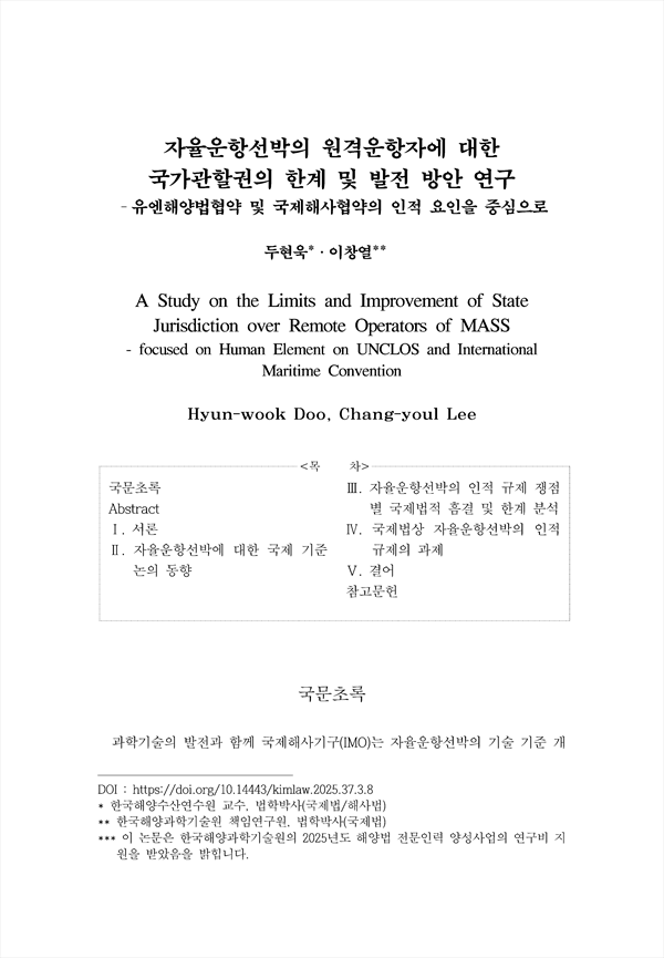 The advancement of technology has precipitated the rise of the Maritime Autonomous Surface Ship (MASS) in the shipping domain, prompting the International Maritime Organization (IMO) to spearhead discussions on the development of the MASS Code since 2017 to ensure safety and security. The main issue to this discourse is State Jurisdiction over the Remote Operator (RO) and the Remote Operation Center (ROC), a novel human element that intervenes directly in vessel operations from shore. The emergence of the RO establishes a jurisdictional disparity between the ship's Flag State and the RO's Territorial State. This fundamentally raises questions regarding the efficacy and limitations of the traditional Flag State Jurisdiction regime established under the United Nations Convention on the Law of the Sea (UNCLOS). This paper is set concerned with the draft MASS Code discussions and aims to analyze the principal international legal issues concerning the RO, diagnose the legal gap in existing international conventions through interpretive analysis of UNCLOS and international maritime conventions including IMO and ILO instruments, and propose alternative strategies for the development of international maritime instruments. The study provides the following findings. First, considering the critical importance of ROs as a function that replaces the duties of conventional seafarers, their recognition as a seafarer in a broad sense is valid through a functional interpretation of UNCLOS. However, the draft MASS Code grants excessive discretion to shipowners regarding RO’s manning, which is not compatible with the Flag State's principle of determining Minimum Safe Manning. Furthermore, the absence of an international standardized stage for RO training and certification linked to the STCW Convention clearly indicates a deficiency in personnel regulation. Second, a comprehensive review of the Maritime Labour Convention (MLC), which defines the duty of the master as the person responsible for onboard safety and personnel management, strongly suggests the necessity to maintain the master's obligation to be onboard for manned MASS. Third, if the ROC is located outside the Flag State's territory, significant limitations arise in the Flag State's effective exercise of jurisdiction under Article 94 of UNCLOS. Consequently, there is a high probability of jurisdictional conflict or gap occurring among the relevant states during marine casualty investigations and maritime crime prosecutions related to MASS. In conclusion, to preserve maritime safety and security in the MASS operational era, it is imperative to clearly establish the seafarer status of ROs and urgently implement their training and certification system in conjunction with the STCW Convention. Furthermore, securing the efficacy of the Flag State's extra-territorial jurisdiction requires the establishment of international cooperation and a parallel enforcement regime for jurisdiction through the conclusion of bilateral or multilateral agreements between states.