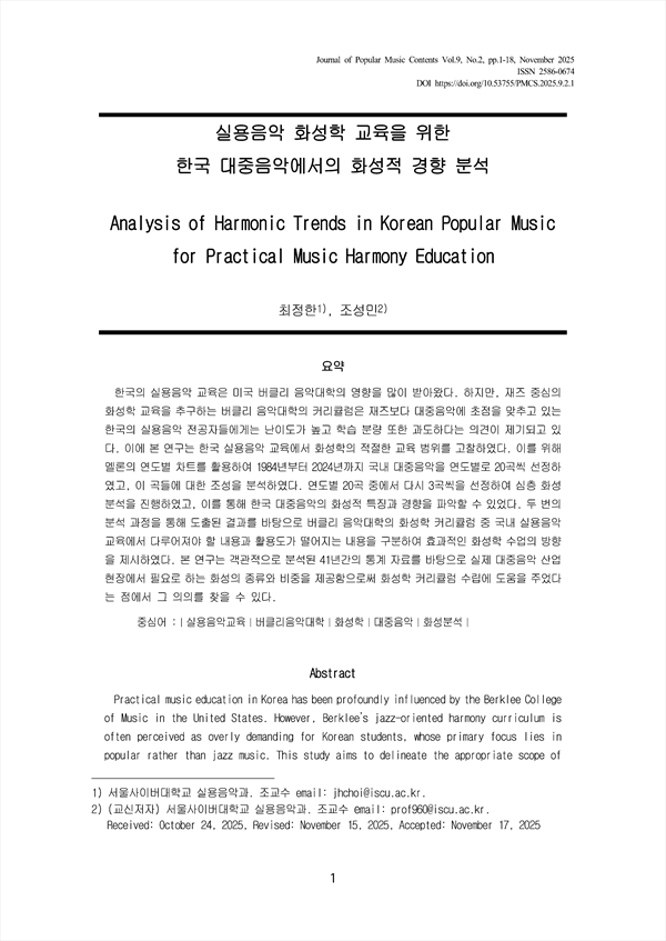 Practical music education in Korea has been profoundly influenced by the Berklee College of Music in the United States. However, Berklee’s jazz-oriented harmony curriculum is often perceived as overly demanding for Korean students, whose primary focus lies in popular rather than jazz music. This study aims to delineate the appropriate scope of harmony education within Korea’s practical music programs. Using the Melon annual charts, 20 representative songs per year from 1984 to 2024 were analyzed for tonality, and three major-key songs from each year were selected for detailed harmonic analysis. This process allowed us to identify long-term harmonic characteristics and trends in Korean popular music. Based on these results, the study proposes a refined curriculum framework that prioritizes essential harmonic concepts for practical music education, ensuring both efficiency and relevance to the domestic popular music industry. This study gains significance in providing insights into the types and proportions of harmony needed in the actual field of the popular music industry based on objectively analyzed statistical data spanning 41 years.
