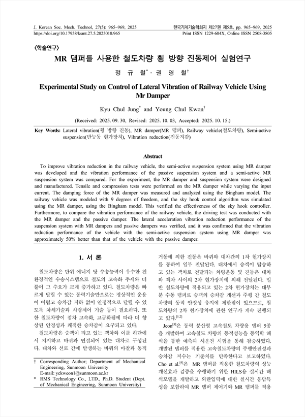 To improve vibration reduction in the railway vehicle, the semi-active suspension system using MR damper was developed and the vibration performance of the passive suspension system and a semi-active MR suspension system was compared. For the experiment, the MR damper and suspension system were designed and manufactured. Tensile and compression tests were performed on the MR damper while varying the input current. The damping force of the MR damper was measured and analyzed using the Bingham model. The railway vehicle was modeled with 9 degrees of freedom, and the sky hook control algorithm was simulated using the MR damper, using the Bingham model. This verified the effectiveness of the sky hook controller. Furthermore, to compare the vibration performance of the railway vehicle, the driving test was conducted with the MR damper and the passive damper. The lateral acceleration vibration reduction performance of the suspension system with MR dampers and passive dampers was verified, and it was confirmed that the vibration reduction performance of the vehicle with the semi-active suspension system using MR damper was approximately 50% better than that of the vehicle with the passive damper.