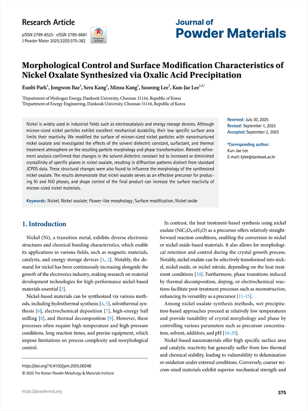 Nickel is widely used in industrial fields such as electrocatalysis and energy storage devices. Although micron-sized nickel particles exhibit excellent mechanical durability, their low specific surface area limits their reactivity. We modified the surface of micron-sized nickel particles with nanostructured nickel oxalate and investigated the effects of the solvent dielectric constant, surfactant, and thermal treatment atmosphere on the resulting particle morphology and phase transformation. Rietveld refinement analysis confirmed that changes in the solvent dielectric constant led to increased or diminished crystallinity of specific planes in nickel oxalate, resulting in diffraction patterns distinct from standard JCPDS data. These structural changes were also found to influence the morphology of the synthesized nickel oxalate. The results demonstrate that nickel oxalate serves as an effective precursor for producing Ni and NiO phases, and shape control of the final product can increase the surface reactivity of micron-sized nickel materials.
