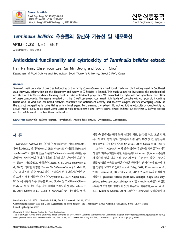 본 연구에서는 동남아시아에서 오랫동안 약용 식물로 사용되어 오고 있는 T. bellirica 추출물의 생리활성을 항산화 기능성에 초점 을 두고 연구하였다. 그 결과, T. bellirica 추출물은 플라보노이드 및 탄닌산과 같은 다량이 폴리페놀 성분을 함유하고 있는 것으로 분석되었고, 시험관과 세포수준에서 모두 ROS 소거 활성을 보이고 항산화효소 활성을 향상시키는 것으로 나타나, 항산화 기능성 소재 로서 잠재력을 제시하였다. 아울러 실질적 섭취수준에서 세포성장 을 저해하지 않고 DNA tail을 형성하지 않으므로, 잠재적 세포독성 및 유전독성 유발 가능성이 낮은 것으로 평가되었다. T. bellirica 추출물의 항산화 기능성에 대한 심도 깊은 연구 및 in vivo 수준에 서의 독성 연구가 추가적으로 요구되나, 이와 같은 결과는 본 추출 물을 안전한 수준에서 항산화 기능성 성분으로 활용하는데 기초자 료로 활용될 수 있을 것이다.