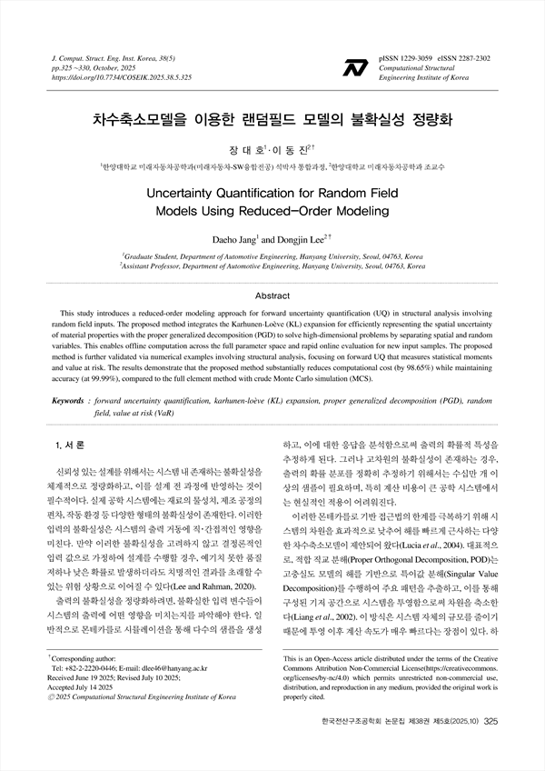 본 논문에서는 랜덤 필드 입력을 갖는 구조 해석 문제에서의 순방향 불확실성 정량화(Forward Uncertainty Quantification, UQ)를 위한 차수축소 모델링 기법을 제안한다. 제안된 기법은 재료 물성의 공간적 불확실성을 효율적으로 표현하기 위해 Karhunen-Loève (KL) 전개를 활용하고, 공간 변수와 확률 변수를 분리함으로써 고차원 문제를 효율적으로 해석할 수 있도록 Proper Generalized Decomposition(PGD)을 결합하였다. 이와 같은 접근은 전체 매개변수 공간에 대한 오프라인 계산을 가능하게 하며, 새로운 샘플에 대 해서는 빠른 온라인 평가를 제공한다. 본 연구에서는 구조 해석을 포함한 수치 예제를 통해 제안된 방법을 검증하였으며, 평균 및 분 산과 같은 통계적 모멘트와 위험가치(Value at Risk) 계산을 통해 불확실성 정량화의 성능을 평가하였다. 실험 결과, 제안된 방법은 전 통적인 유한요소 해석과 몬테카를로 시뮬레이션(Monte Carlo Simulation, MCS)에 비해 높은 정확도를 유지하면서도 계산 비용을 크 게 절감하는 것으로 나타났다.