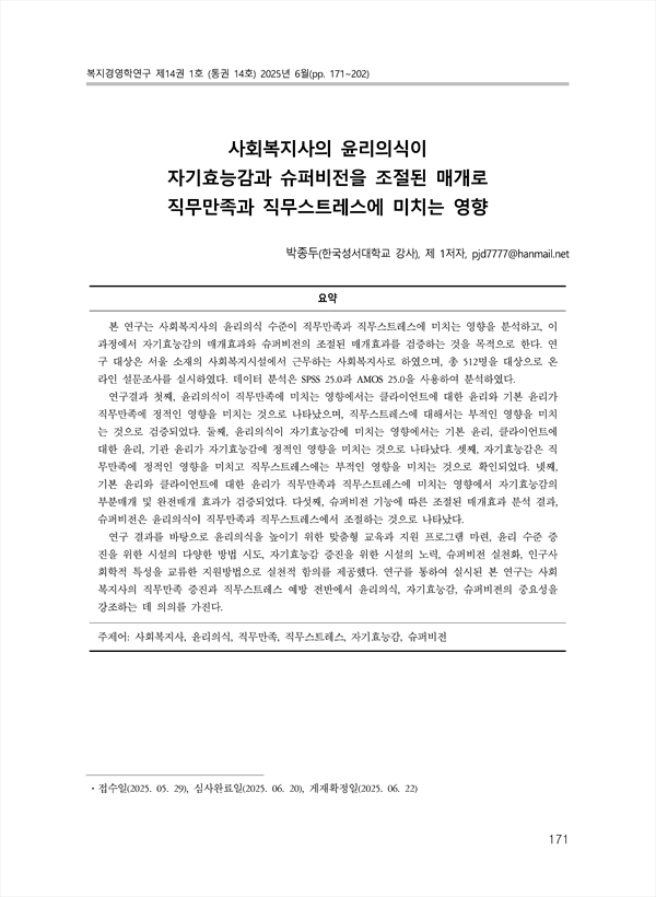 Effects of Social Worker's Ethical Sense on Job Satisfaction and Job Stress through Self-efficacy and Supervision as a Controlled Mediation