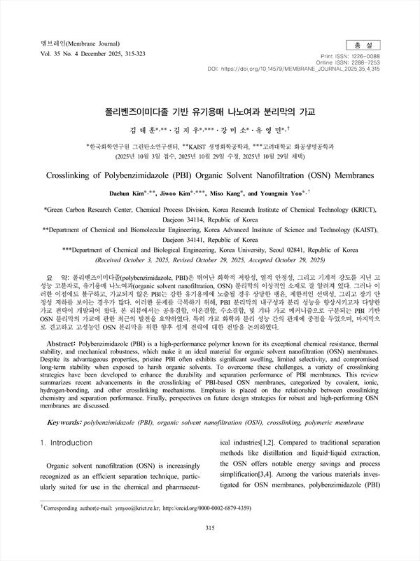 폴리벤즈이미다졸(polybenzimidazole, PBI)은 뛰어난 화학적 저항성, 열적 안정성, 그리고 기계적 강도를 지닌 고 성능 고분자로, 유기용매 나노여과(organic solvent nanofiltration, OSN) 분리막의 이상적인 소재로 잘 알려져 있다. 그러나 이 러한 이점에도 불구하고, 가교되지 않은 PBI는 강한 유기용매에 노출될 경우 상당한 팽윤, 제한적인 선택성, 그리고 장기 안 정성 저하를 보이는 경우가 많다. 이러한 문제를 극복하기 위해, PBI 분리막의 내구성과 분리 성능을 향상시키고자 다양한 가교 전략이 개발되어 왔다. 본 리뷰에서는 공유결합, 이온결합, 수소결합, 및 기타 가교 메커니즘으로 구분되는 PBI 기반 OSN 분리막의 가교에 관한 최근의 발전을 요약하였다. 특히 가교 화학과 분리 성능 간의 관계에 중점을 두었으며, 마지막으 로 견고하고 고성능인 OSN 분리막을 위한 향후 설계 전략에 대한 전망을 논의하였다.