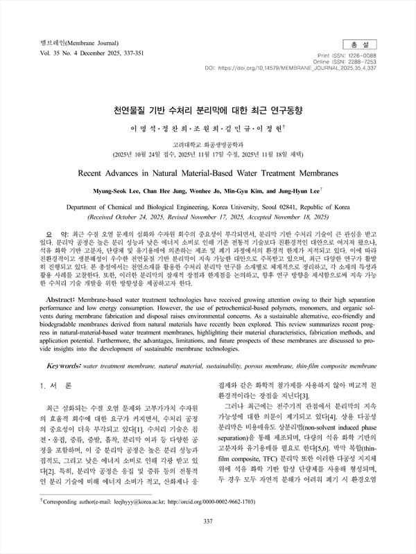 최근 수질 오염 문제의 심화와 수자원 회수의 중요성이 부각되면서, 분리막 기반 수처리 기술이 큰 관심을 받고 있다. 분리막 공정은 높은 분리 성능과 낮은 에너지 소비로 인해 기존 전통적 기술보다 친환경적인 대안으로 여겨져 왔으나, 석유 화학 기반 고분자, 단량체 및 유기용매에 의존하는 제조 및 폐기 과정에서의 환경적 한계가 지적되고 있다. 이에 따라 친환경적이고 생분해성이 우수한 천연물질 기반 분리막이 지속 가능한 대안으로 주목받고 있으며, 최근 다양한 연구가 활발 히 진행되고 있다. 본 총설에서는 천연소재를 활용한 수처리 분리막 연구를 소재별로 체계적으로 정리하고, 각 소재의 특성과 활용 사례를 고찰한다. 또한, 이러한 분리막의 잠재적 장점과 한계점을 논의하고, 향후 연구 방향을 제시함으로써 지속 가능 한 수처리 기술 개발을 위한 방향성을 제공하고자 한다.