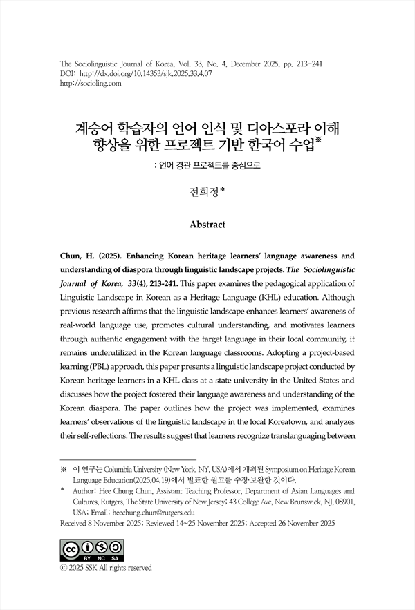 This paper examines the pedagogical application of Linguistic Landscape in Korean as a Heritage Language (KHL) education. Although previous research affirms that the linguistic landscape enhances learners’ awareness of real-world language use, promotes cultural understanding, and motivates learners through authentic engagement with the target language in their local community, it remains underutilized in the Korean language classrooms. Adopting a project-based learning (PBL) approach, this paper presents a linguistic landscape project conducted by Korean heritage learners in a KHL class at a state university in the United States and discusses how the project fostered their language awareness and understanding of the Korean diaspora. The paper outlines how the project was implemented, examines learners’ observations of the linguistic landscape in the local Koreatown, and analyzes their self-reflections. The results suggest that learners recognize translanguaging between Korean and English, understand the distinct functions of each language, and identify the marketing strategies informing language choices. The project also encouraged learners to reflect on their own identities as Korean Americans, their local Korean American communities, and, more broadly, the Korean diaspora in the United States.