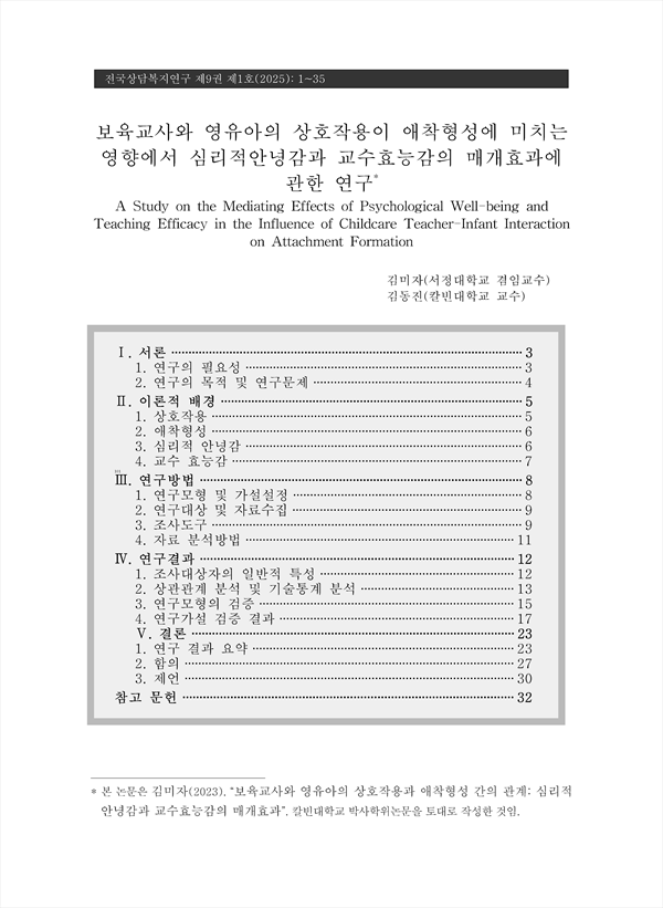 보육교사와 영유아의 상호작용이 애착형성에 미치는 영향에서 심리적안녕감과 교수효능감의 매개효과에 관한 연구
