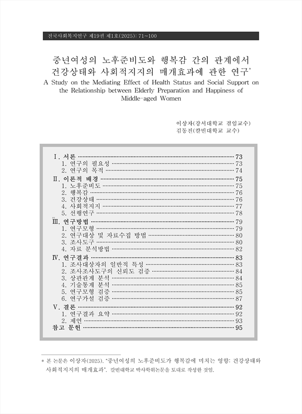 중년여성의 노후준비도와 행복감 간의 관계에서 건강상태와 사회적지지의 매개효과에 관한 연구